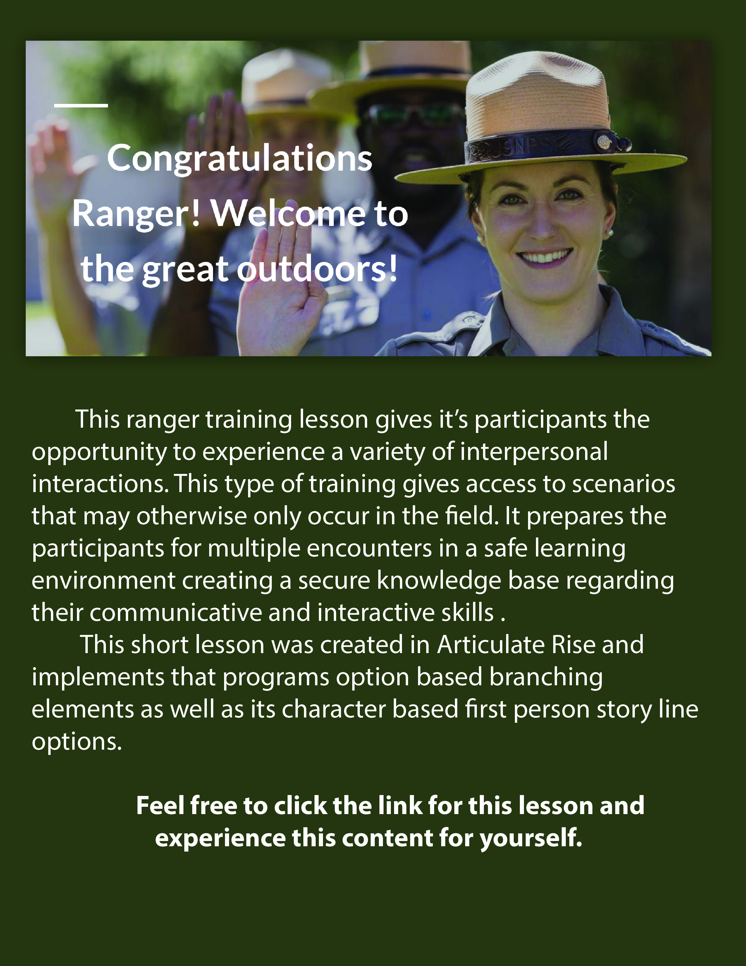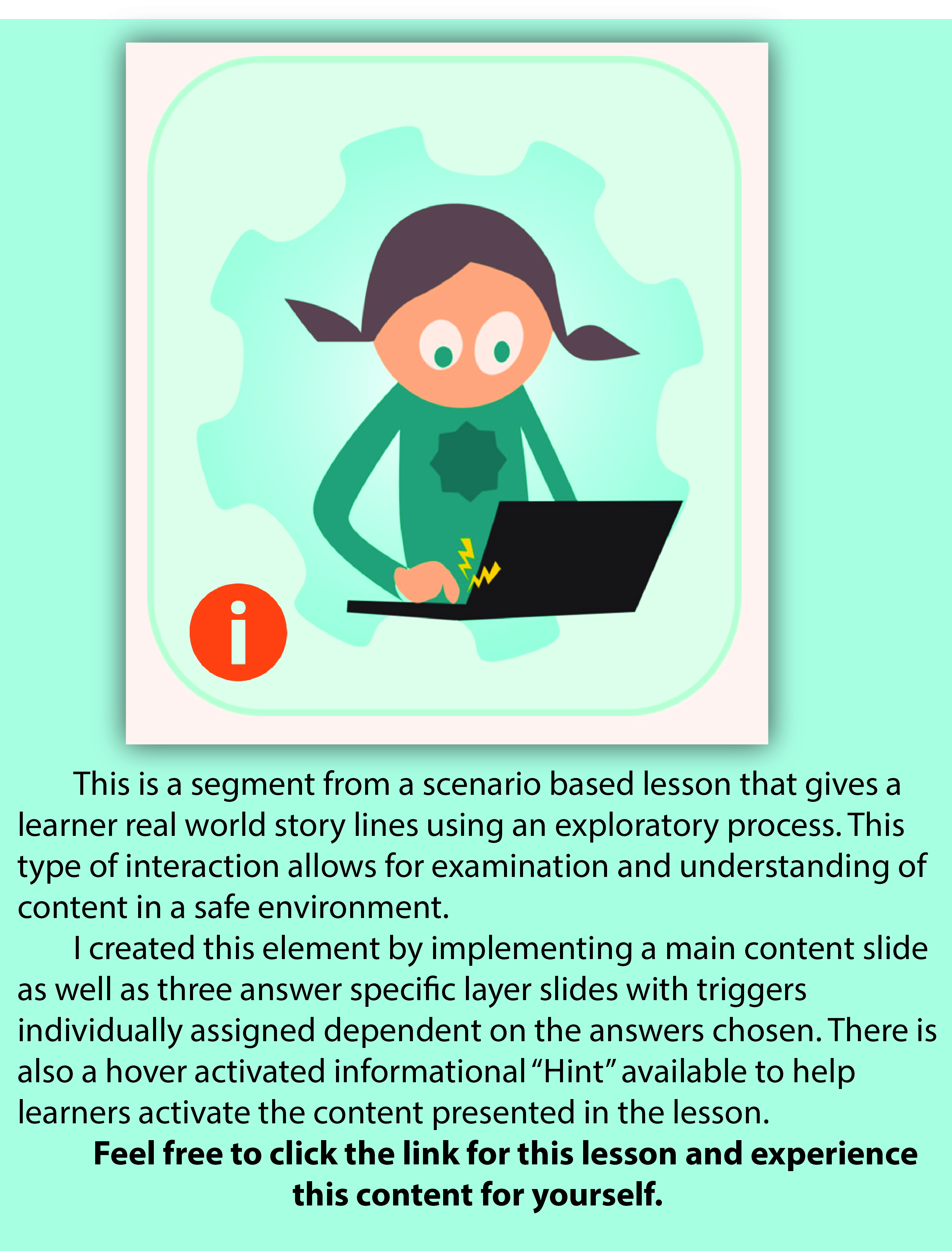 These short sample lessons and interactive elements are examples of the kinds of attributes I can create using a variety of digital learning platforms. They show the type of content achievable for your programs.